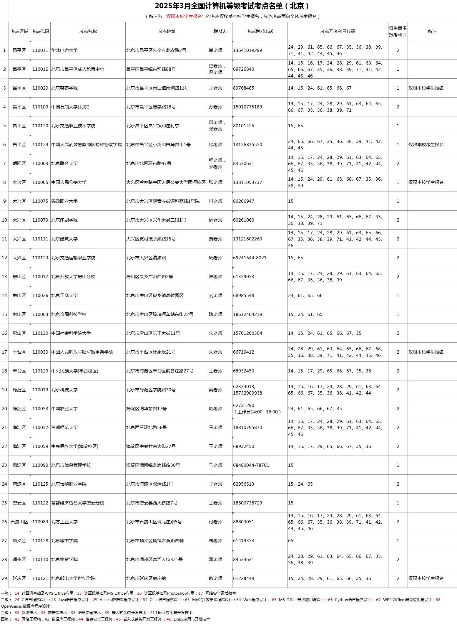 2025年3月NCRE考点名单(北京)